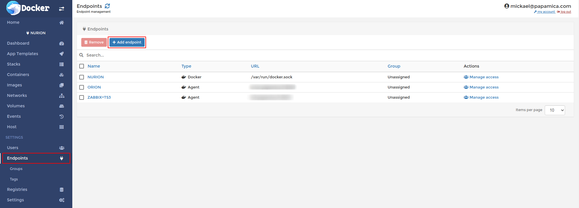 Pour ajouter le serveur à notre Portainer, rendez vous dans “***Settings > Endpoints > + Add endpoint***” :
