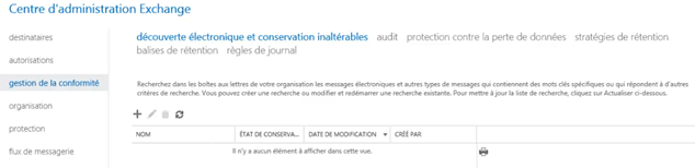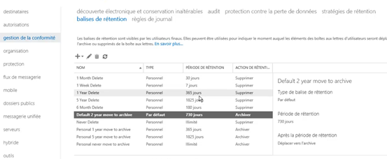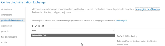La liste des stratégie de rétention est disponible dans « gestion de la conformité » puis « stratégies de rétention »