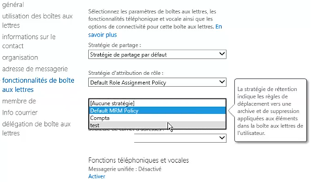 Dans la partie « fonctionnalités de boite aux lettres » de choisir la stratégie désirée dans la section « stratégie de rétention »
