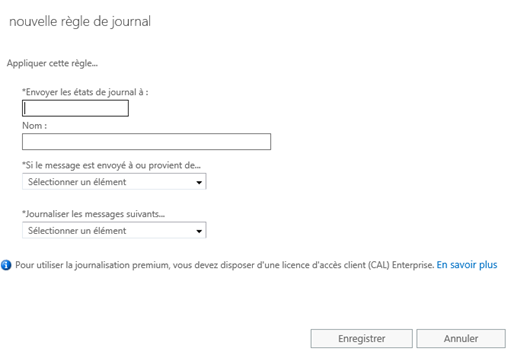 New-JournalRule -Name «nom_dela_règle» -JournalEmailAddress «adresse_email_du_journal» -Scope «type_de_scope» -Recipient «adresse_mail_qui_sera_journalisée» -Enabled $True