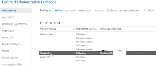 Pour appliquer une stratégie sur une boite aux lettres, cliquer sur « destinataires » puis faire un double clic sur la boite aux lettres ciblée.