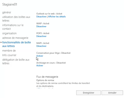 Puis dans « fonctionnalité de boites aux lettres » chercher l’option « conservation pour litige » puis cliquer sur « activer ».