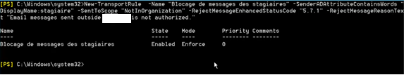 New-TransportRule -Name «nom_de_la_règle» -SenderADAttributeContainWords «DisplayName:nom_du_groupe_de_users_AD» -SentToScope «nom_du_périmètre_d’action» -RejectMessageEnhancedSatusCode «N°_d’erreur» -RejectMessageReasonText «text_explicatif_du_rejet»