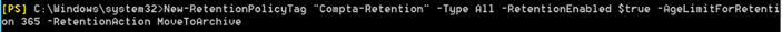 New-RetentionPolicyTag «nom_de_la_balise» -Type «choix_du_type» -AgeLimitForRetention «nb_de_jours» -retentionAction «action_a_effectuer» -RetentionEnabled $True