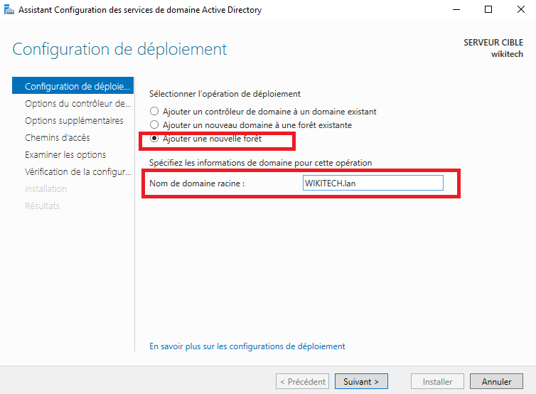 - On choisit le nom de notre domaine (Renseigner le nom que vous souhaitez), nous allons choisir wikitech.lan.