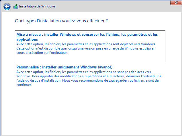 - Choisir le type d’installation : **Personnalisé : installer uniquement Windows** (avancé)