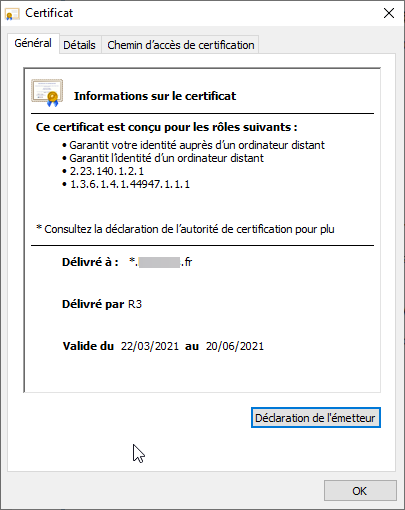 Dans ce cas, le domaine exemple.fr ainsi que tous ses sous-domaines seront certifiés. Voici le résultat :