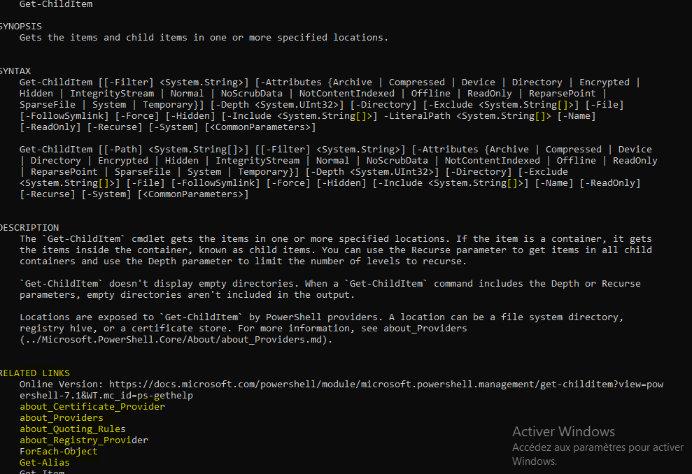 Par exemple si vous voulez de l'aide sur la syntaxe de commande Get-ChildItem