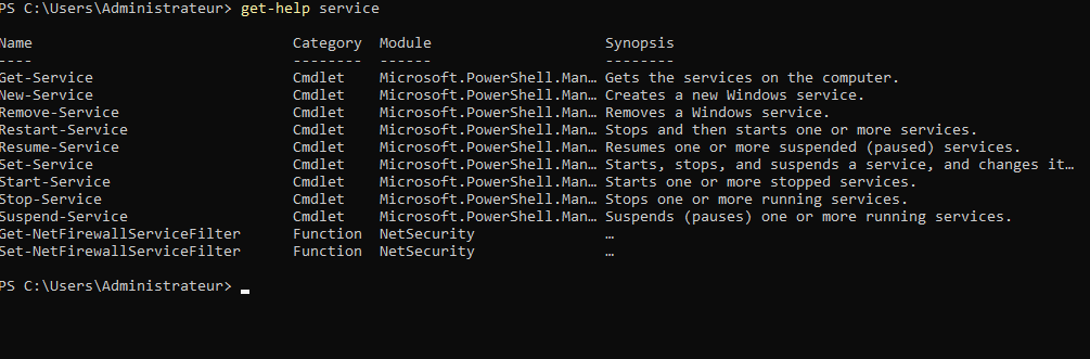 La commande Get-Help permet également de rechercher une commande si, par exemple, vous souhaitez trouver une commande qui gère les services.