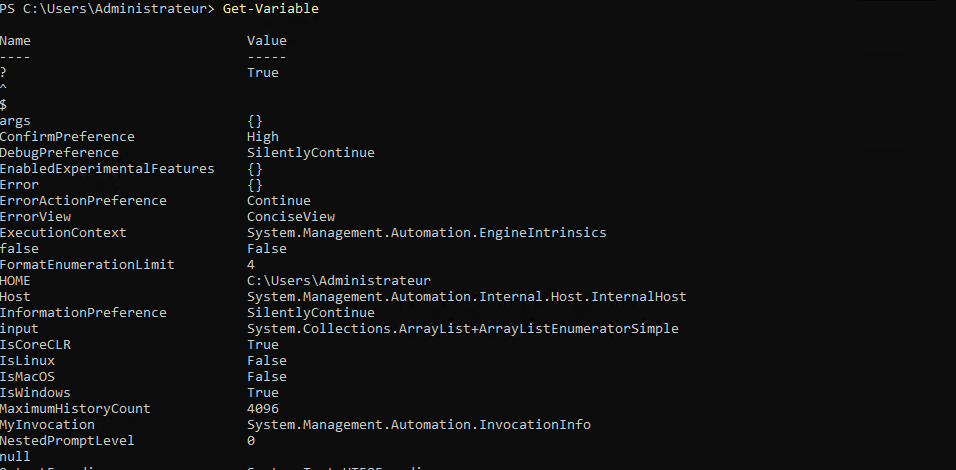 Vous comprenez, à présent pourquoi je vous ai parlé des variables automatiques et de préférences avant. En effet, la commande Get-Variable vous les liste toutes par noms et indique quelle(s) valeur(s) est stockée(s).Je met volontairement un “(s)” car elles peuvent parfois en contenir plusieurs. Lorsque nous verrons comment créer nos propres variables, elles viendront s'ajouter à cette liste.