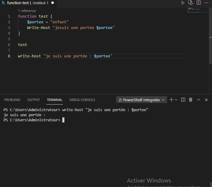 Dans cette exemple, nous utilisons une fonction que nous verrons plus tard. Dans le bloc de script symbolisé par {} la variable $portee est bien lu par la fonction. Hors, à la ligne 8 le Write-Host ne peut pas lire cette variable. La variable $portee se limite aux {} .