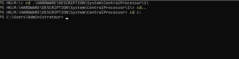 Exemple, si vous voulez parcourir la base de registre machine il suffit de taper cd hklm: et vous vous retrouvez dans la base de registre et la parcourir comme si c'était un filesystem et revenir dans votre arborescence Windows avec un cd c:.