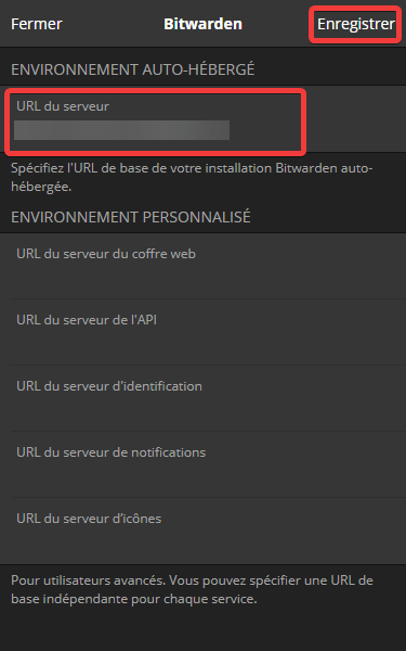 2. Entrez l'URL de votre serveur et cliquez sur “Enregistrer”