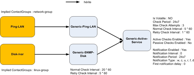 Un « Template » ou « modèle » est une pré-configuration de paramètres d’un objet (hôte, service, etc.) qui pourra être utilisé pour le configurer. Le principal avantage est de pouvoir définir des valeurs par défaut pour certains objets afin d’accélérer la création d’objets similaires. Lors de la création d’un Template, le nom est le seul paramètre obligatoire, tous les autres sont optionnels.