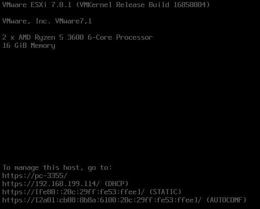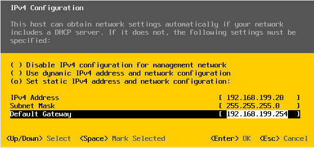 Tout d'abord, on va attribuer une adresse IP fixe et un nom d'hôte à notre ESXI. On presse F2, on rentre le mot de passe root.