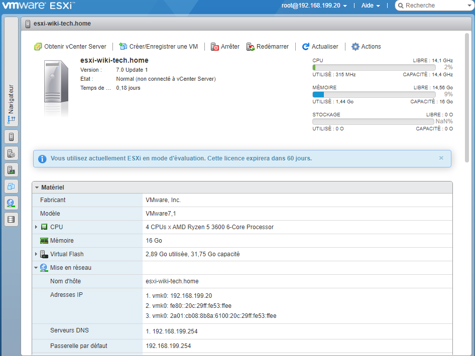 En rentrant l'adresse IP dans un navigateur, on arrive sur l'interface web de l'ESXi.