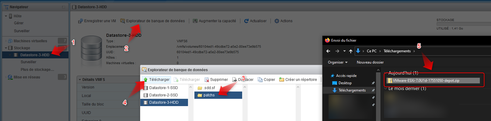 Plusieurs solutions sont possibles pour mettre à disposition la mise à jour sur l’ESXI, soit via un accès FTP ou également par le dépôt directement dans un datastore *(solution que nous utilisons ici)*.