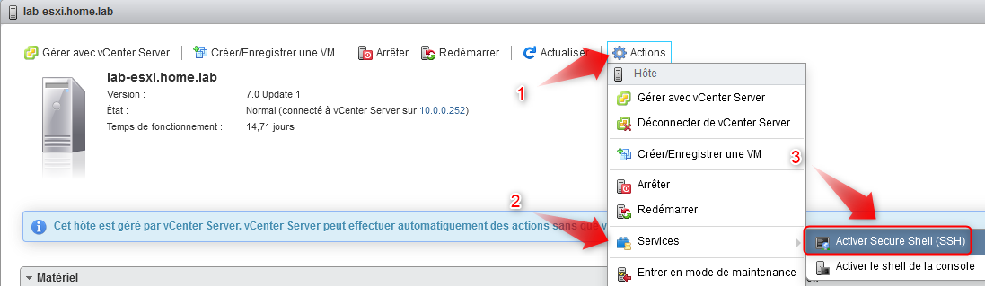 La mise à jour se réalise via une ligne de commande par SSH. Nous devons donc faire l'activation de l'accès SSH sur notre ESxi.